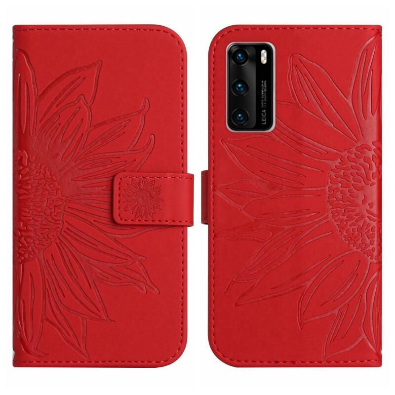 Θήκη τηλεφώνου Huawei P40 με αίσθηση δέρματος, σχέδιο ηλίανθου, τύπου flip με λουρί (Κόκκινο)