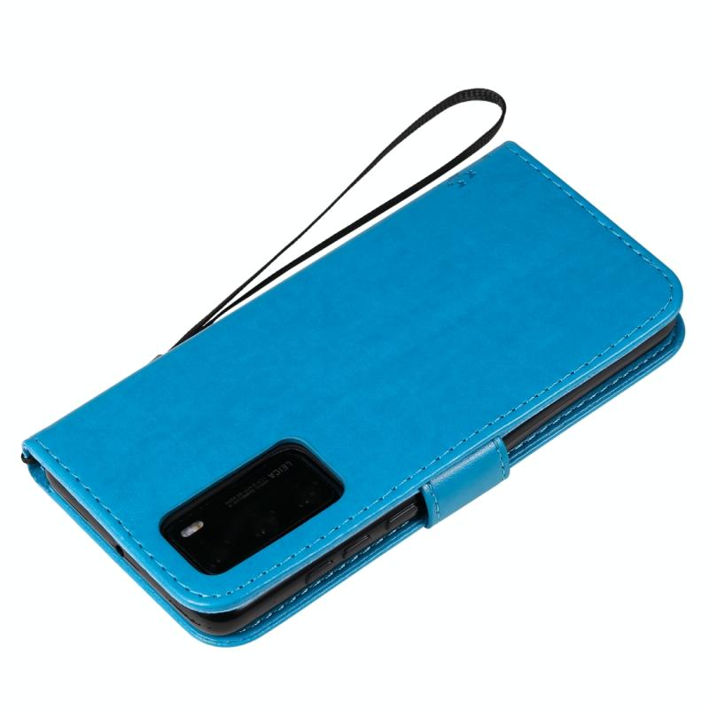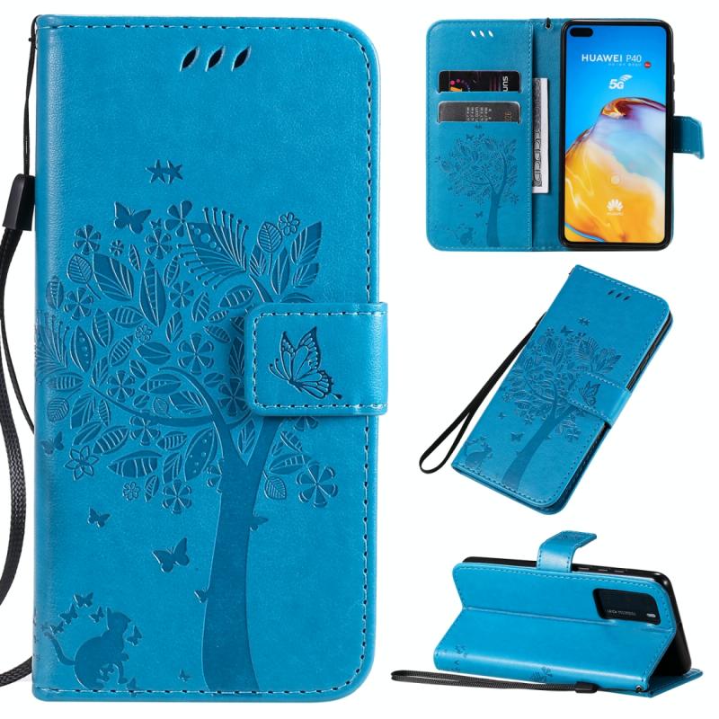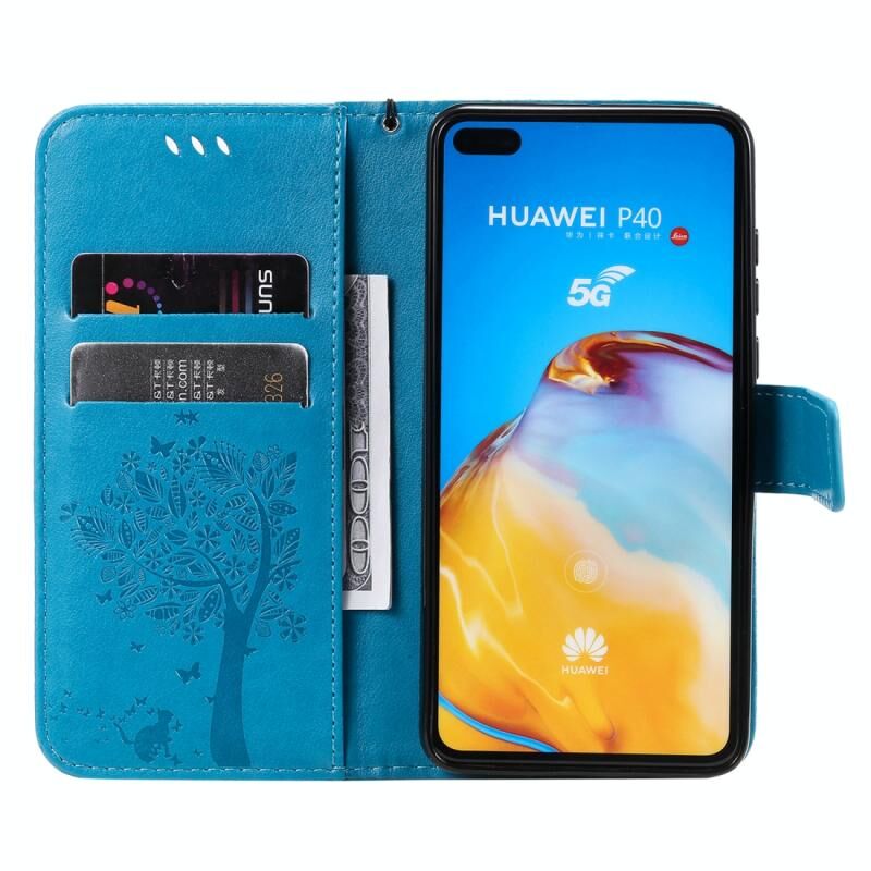 Θήκη για Huawei P40 με σχέδιο δέντρου & γάτας, με εκτύπωση υπό πίεση, οριζόντια αναδίπλωση, από δερματίνη PU με βάση στήριξης & θήκες για κάρτες & πορτοφόλι & κορδόνι (Πράσινο)