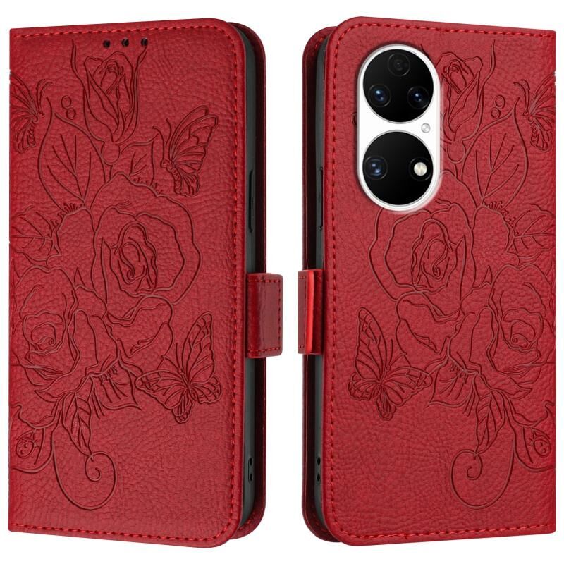 Για Huawei P50 ανάγλυφο Rose RFID Anti-theft δερμάτινη θήκη τηλεφώνου (κόκκινο)
