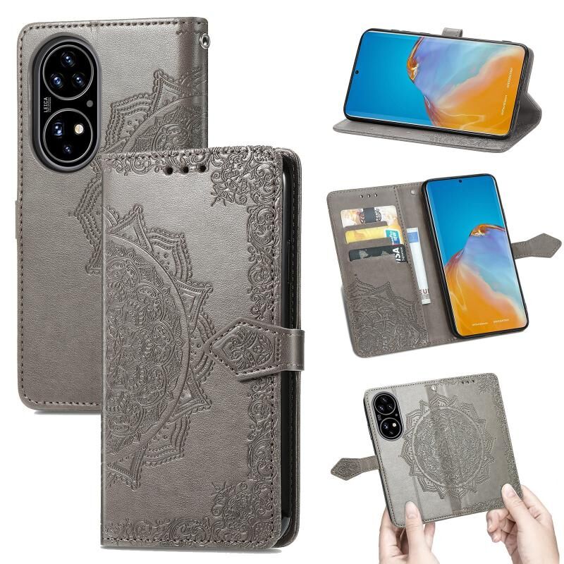 Για Huawei P50 Mandala λουλούδι ανάγλυφο οριζόντια Flip δερμάτινη θήκη με βραχίονα / υποδοχή κάρτας / πορτοφόλι / κορδόνι (γκρι)