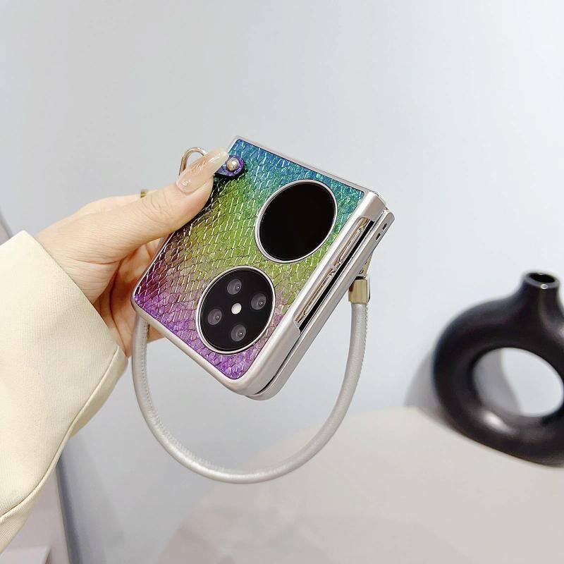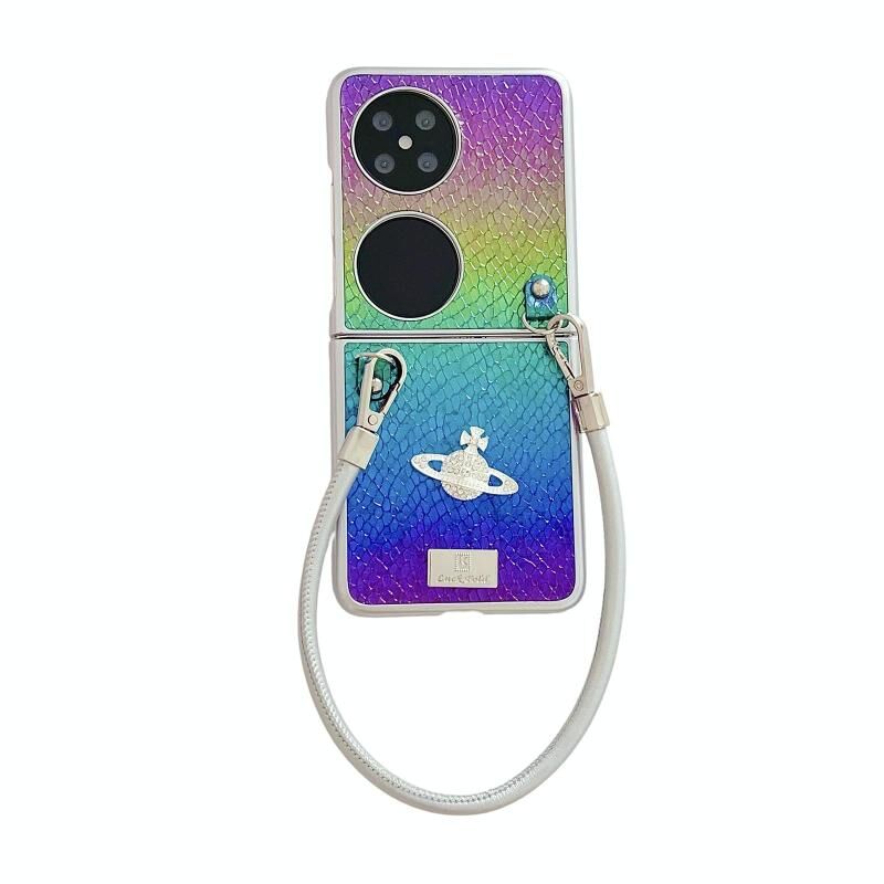 Θήκη κινητού τηλεφώνου πλήρους κάλυψης με σχέδιο Kirin για Huawei P50 Pocket με λουρί καρπού (Rainbow)