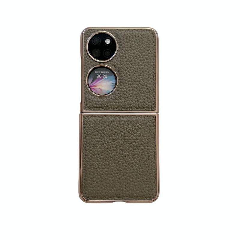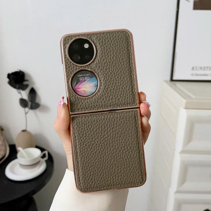 Θήκη τηλεφώνου από γνήσιο δέρμα με υφή Lychee και ηλεκτρολυτική επίστρωση για Huawei P50 Pocket Nano (Μαύρο)
