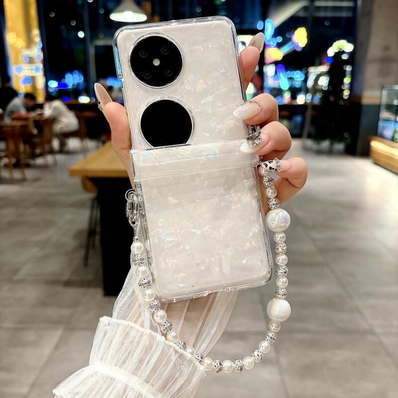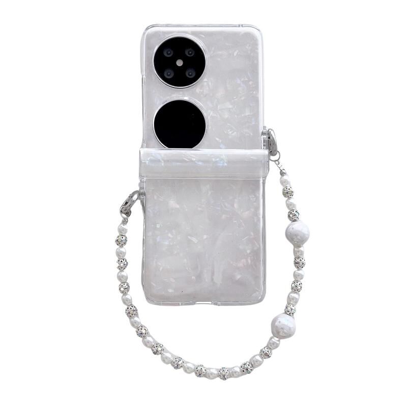 Για Huawei P50 Pocket τρία μέρη Pearlescent Shell Υφή τηλέφωνο υπόθεση με βραχιόλι (μπεζ)