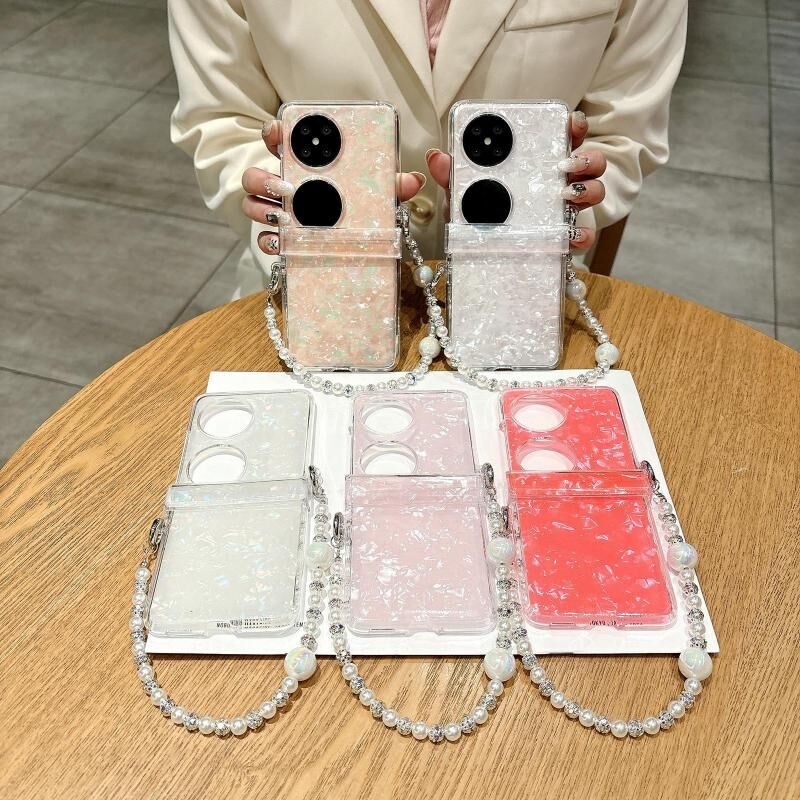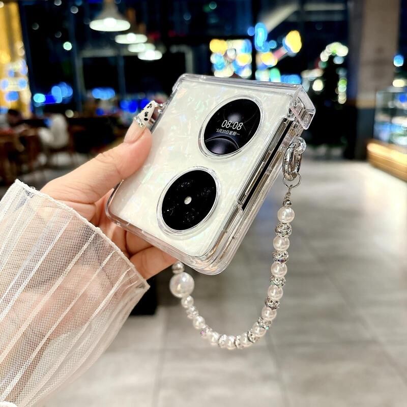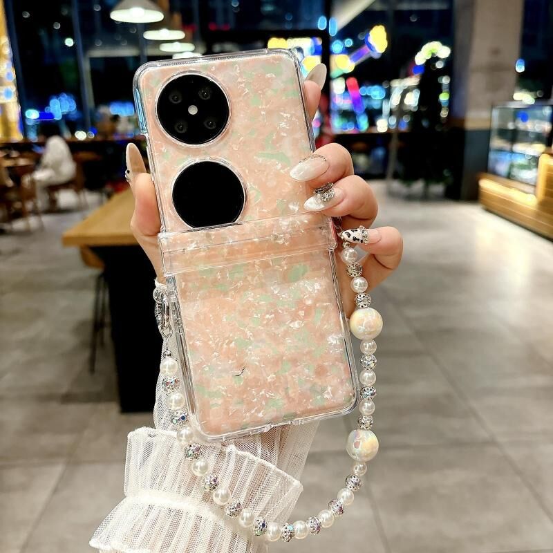 Για Huawei P50 Pocket τρία μέρη Pearlescent Shell Υφή τηλέφωνο υπόθεση με βραχιόλι (ροζ πράσινο)