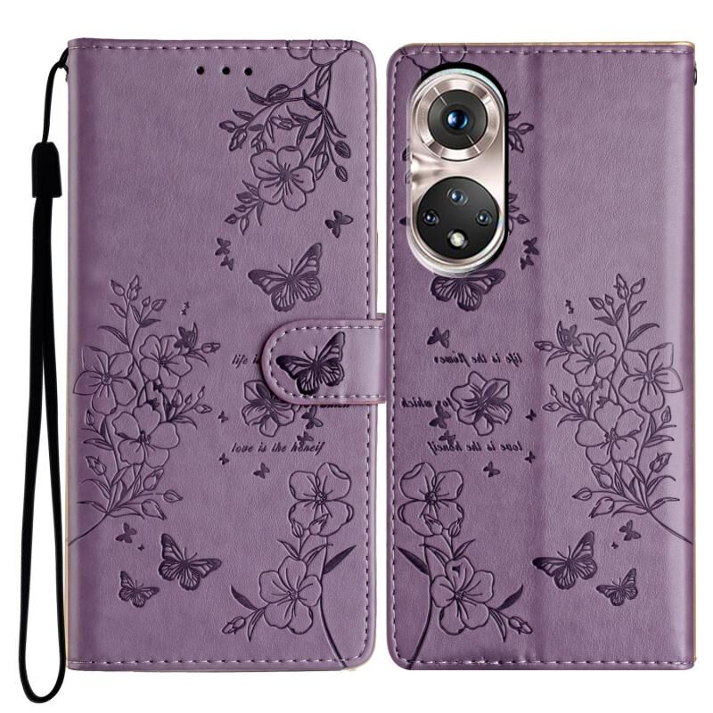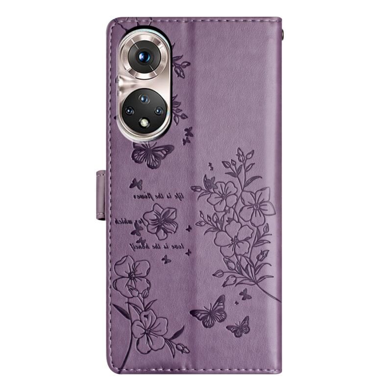 Θήκη τηλεφώνου Huawei P50 Pro με σχέδια πεταλούδες και λουλούδια από δέρμα (Μωβ)