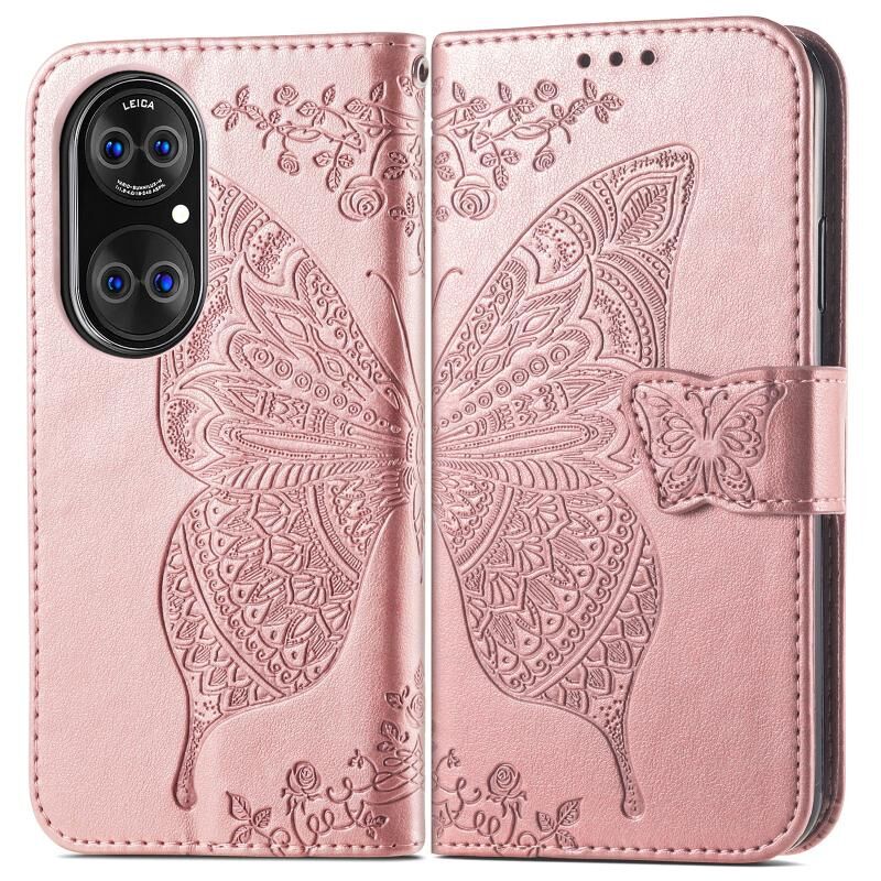 Θήκη τύπου βιβλιαρίου από δέρμα με ανάγλυφο σχέδιο πεταλούδας και λουλουδιών για Huawei P50 Pro, με βάση στήριξης, θήκες για κάρτες, πορτοφόλι και κορδόνι (Ροζ Χρυσό)