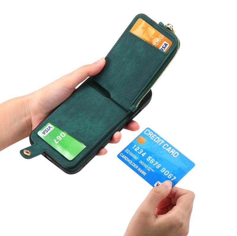 2. Λειτουργία Πορτοφολιού με Φερμουάρ: Η δερμάτινη θήκη είναι εξοπλισμένη με υποδοχές για κάρτες και ένα μικρό ποσό μετρητών.