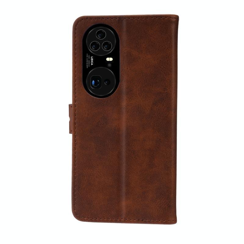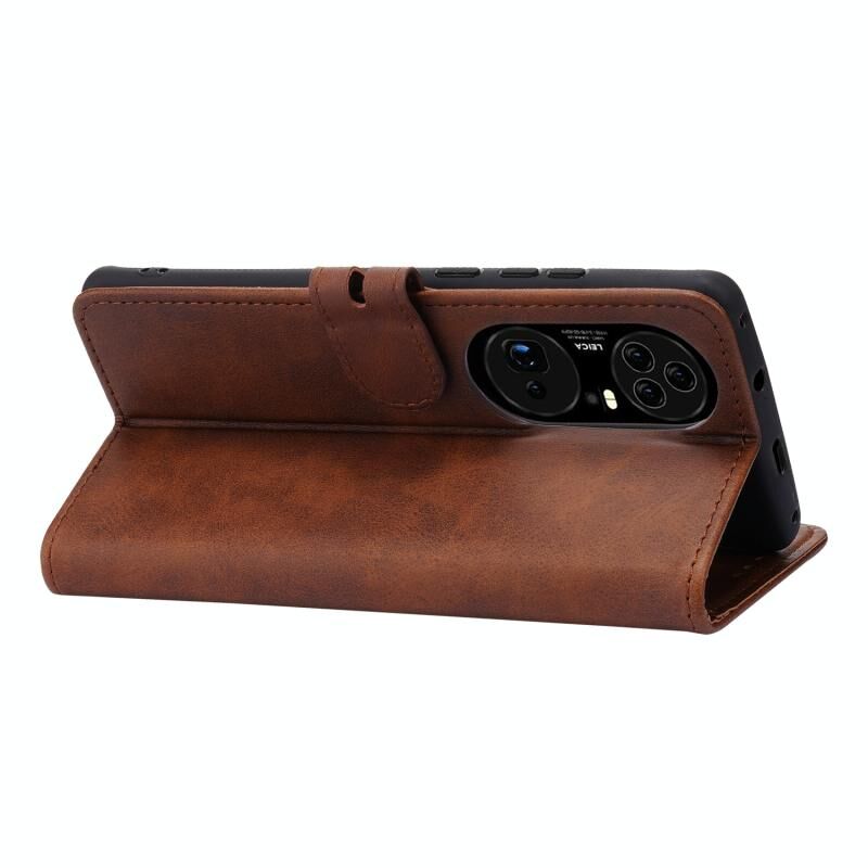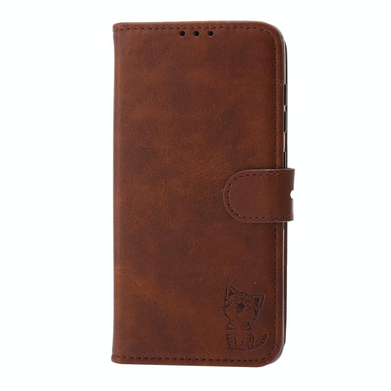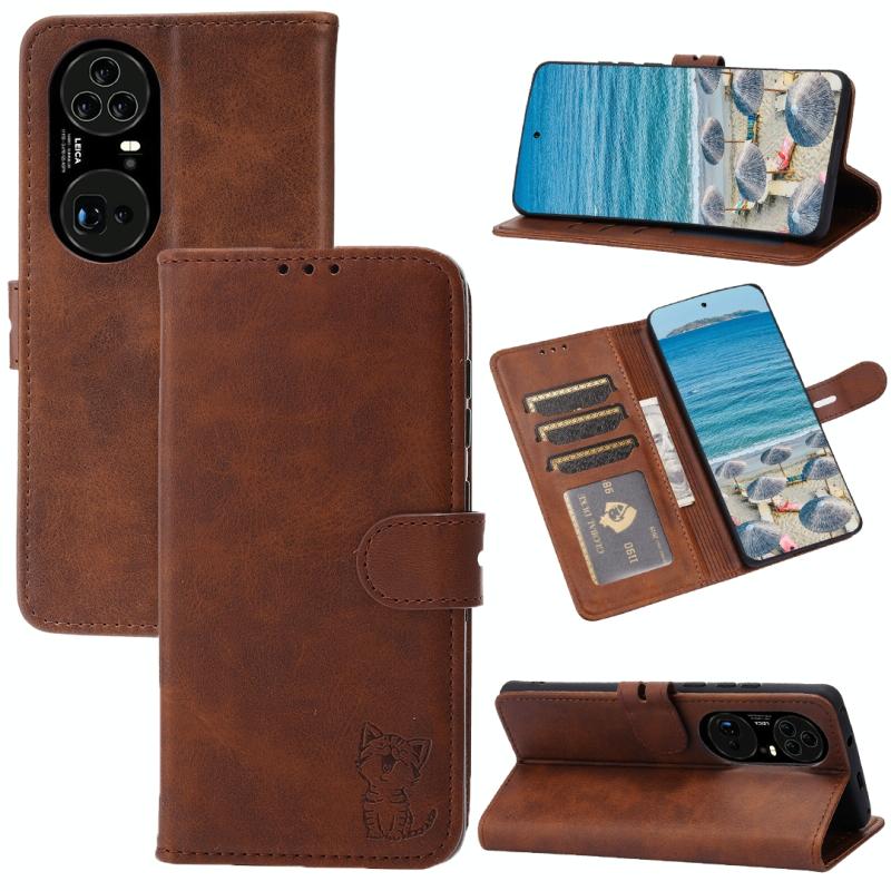 Θήκη δέρματος οριζόντιας αναδίπλωσης με ανάγλυφο σχέδιο χαρούμενης γάτας για Huawei P50 Pro με βάση & υποδοχές καρτών & πορτοφόλι (Καφέ)