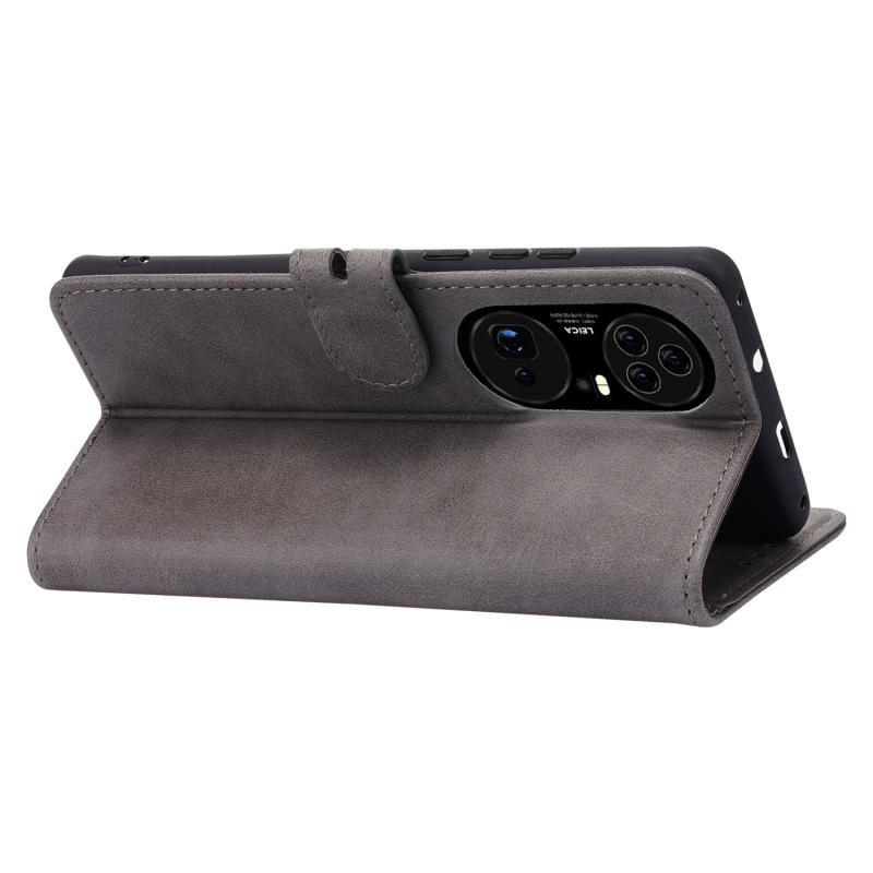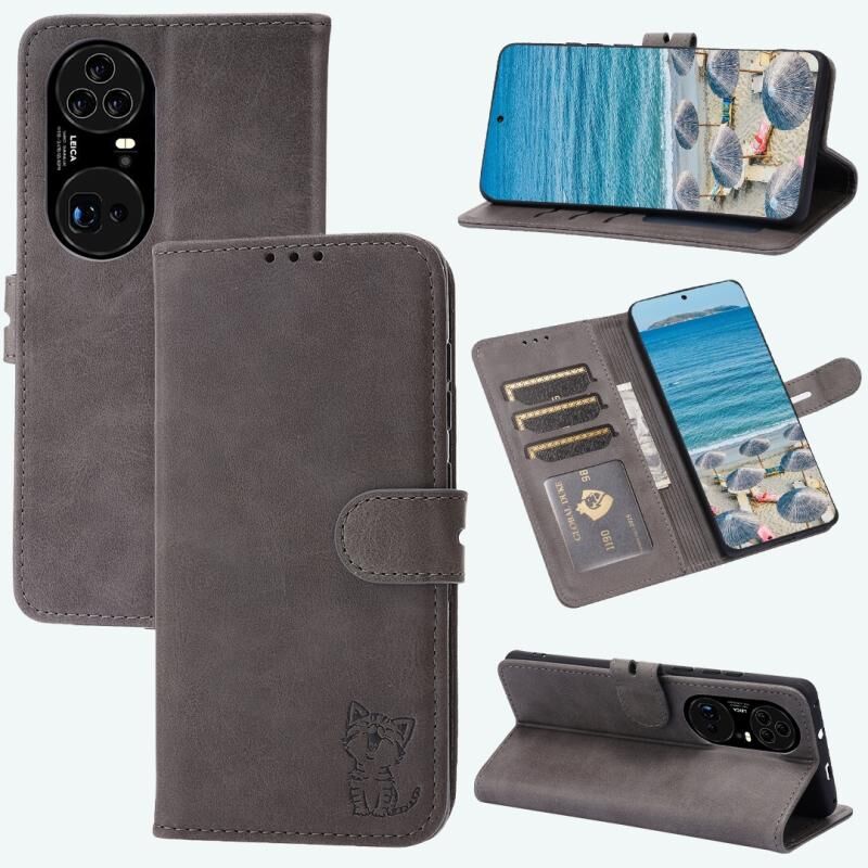 Θήκη δέρματος οριζόντιας αναδίπλωσης με ανάγλυφο σχέδιο χαρούμενης γάτας για Huawei P50 Pro με βάση & υποδοχές καρτών & πορτοφόλι (Καφέ)