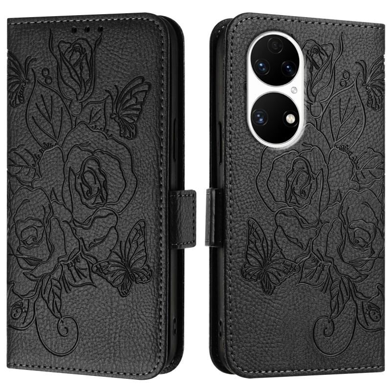 Για Huawei P50 Pro ανάγλυφο Rose RFID Anti-theft δερμάτινη θήκη τηλεφώνου (Μαύρο)