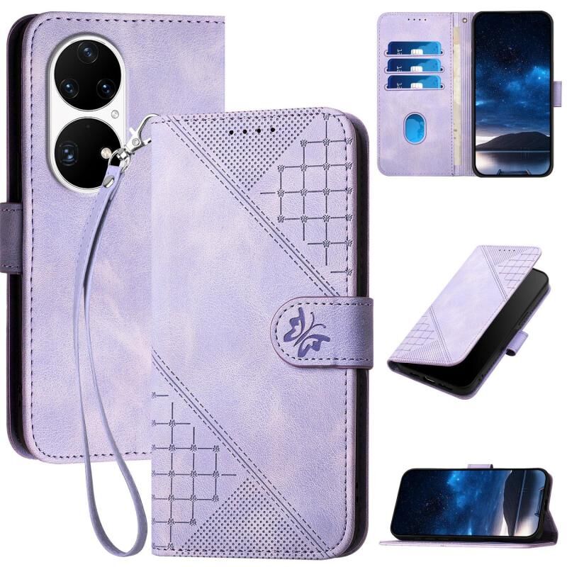 Θήκη τηλεφώνου Huawei P50 Pro με δερμάτινο σχέδιο ανάγλυφου πλέγματος πεταλούδας με κορδόνι (Σκούρο Μπλε)