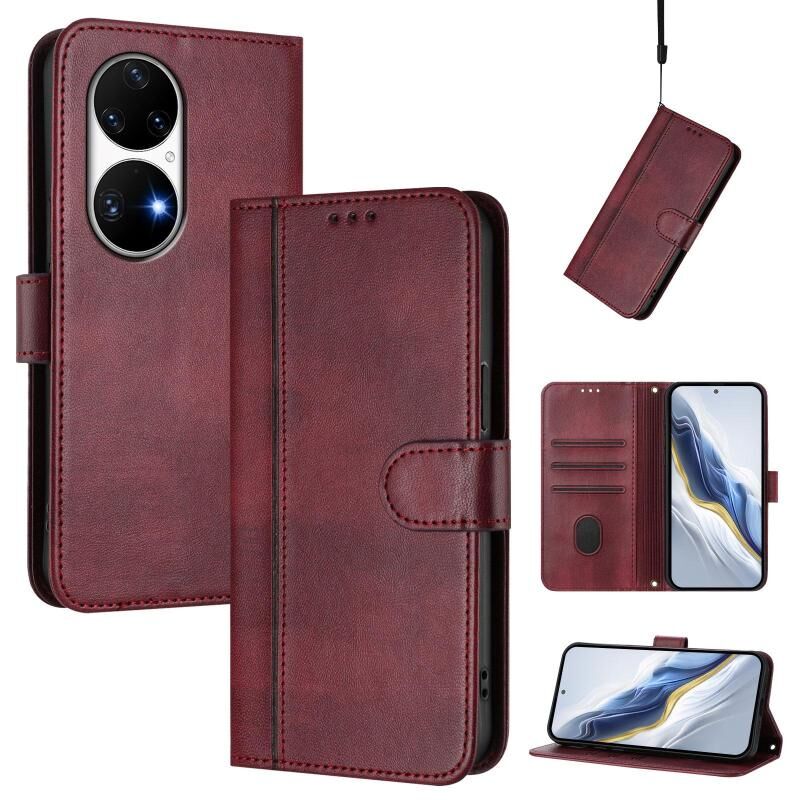 Θήκη τηλεφώνου Huawei P50 Pro Line Splicing Buckle Retro Δερμάτινη (Κρασοκόκκινο)