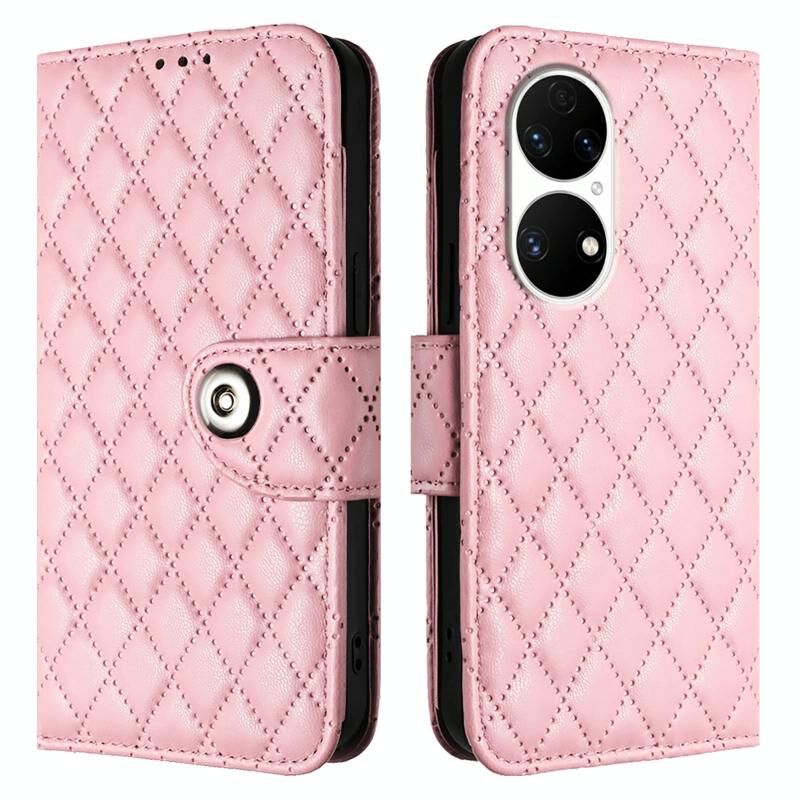Για το Huawei P50 Rhombic Texture Flip δερμάτινη θήκη τηλεφώνου με κορδόνι (ροζ)