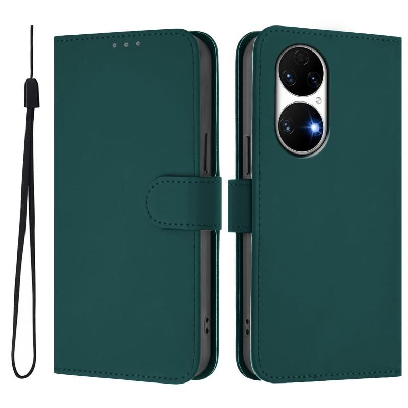 Για το Huawei P50 δέρμα αίσθηση στερεό χρώμα δερμάτινη θήκη τηλεφώνου με κορδόνι (σκούρο πράσινο)