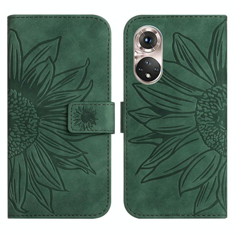 Θήκη τηλεφώνου Huawei P50 με αίσθηση δέρματος, σχέδιο ηλίανθου, τύπου flip με λουρί (Green)
