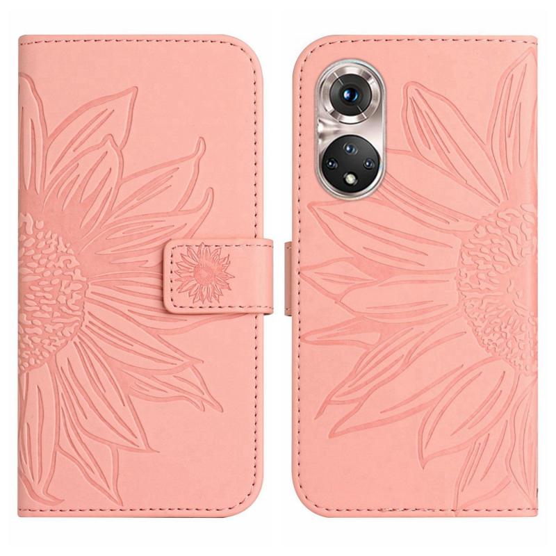 Θήκη τηλεφώνου Huawei P50 με αίσθηση δέρματος, σχέδιο ηλίανθου, τύπου flip με λουρί (Pink)