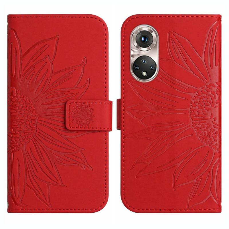Θήκη τηλεφώνου Huawei P50 με αίσθηση δέρματος, σχέδιο ηλίανθου, τύπου flip με λουρί (Red)