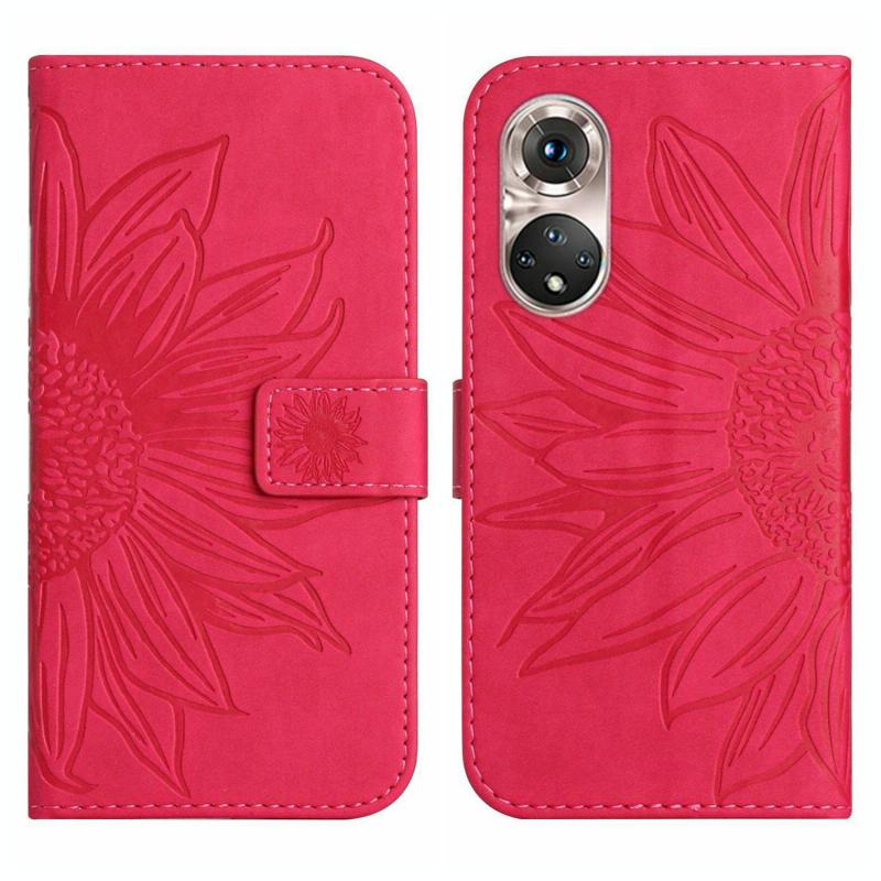 Θήκη τηλεφώνου Huawei P50 με αίσθηση δέρματος, σχέδιο ηλίανθου, τύπου flip με λουρί (Rose Red)
