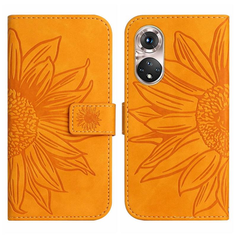 Θήκη τηλεφώνου Huawei P50 με αίσθηση δέρματος, σχέδιο ηλίανθου, τύπου flip με λουρί (Yellow)