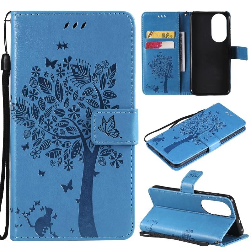 Για το Huawei P50 Tree & Cat Pattern Pressed Printing Horizontal Flip PU Leather Case με θήκη & υποδοχές καρτών & πορτοφόλι & κορδόνι (Μπλε)