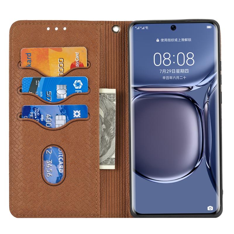 Θήκη Huawei P50 με υφαντή υφή, ραφές, μαγνητικό κλείσιμο, οριζόντια, από δερματίνη PU με βάση στήριξης, θήκες για κάρτες, πορτοφόλι & λουρί (Μαύρο)