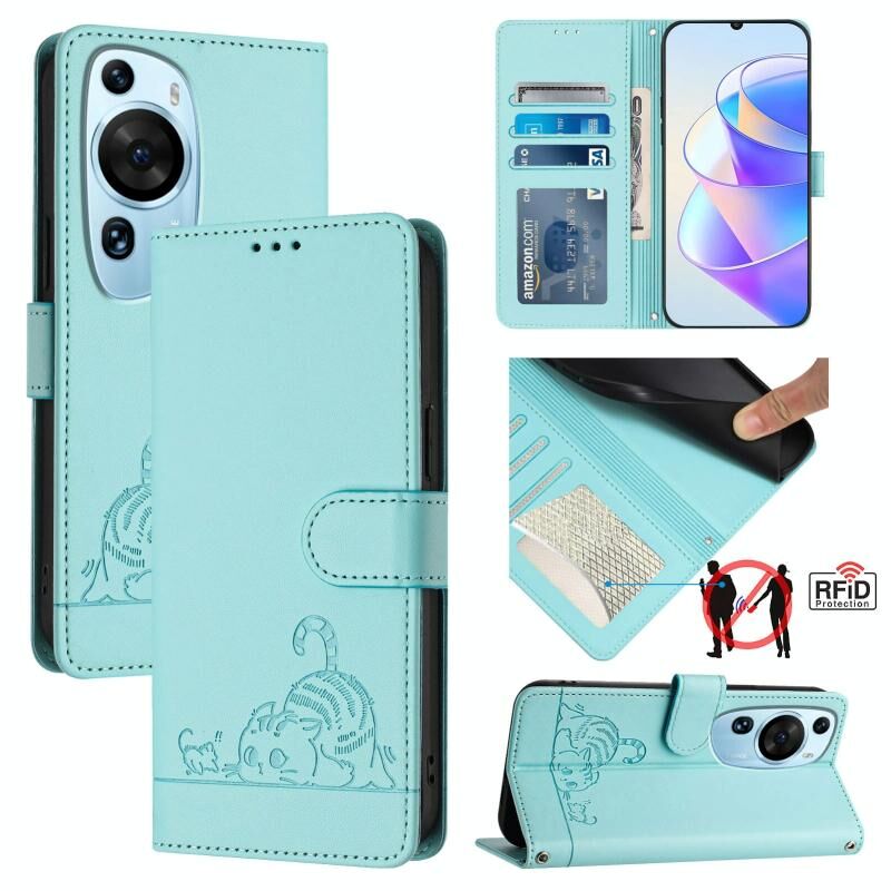 Θήκη τηλεφώνου Huawei P60 Art Cat Rat ανάγλυφο σχέδιο δέρμα με κορδόνι (Μέντας πράσινο)