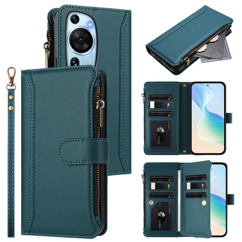 Θήκη δέρματος με μαγνητικό κλείσιμο, φερμουάρ και λουρί χειρός για Huawei P60 Art, με 9 θέσεις για κάρτες (Σκούρο πράσινο)
