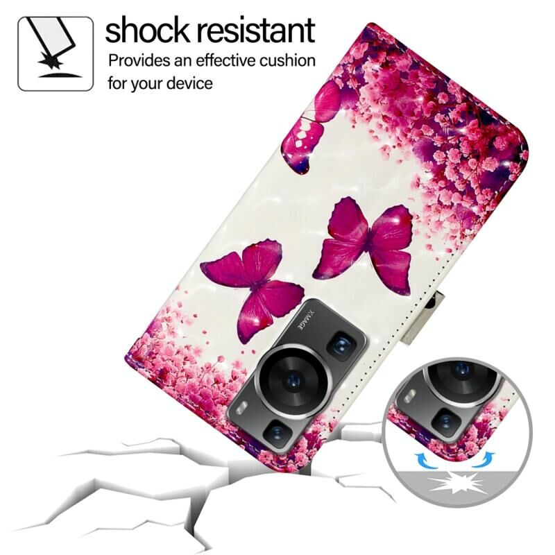 Θήκη τηλεφώνου από δέρμα με οριζόντια αναδίπλωση και τρισδιάστατη ζωγραφική για Huawei P60 Pro (Ροζ Πεταλούδα)