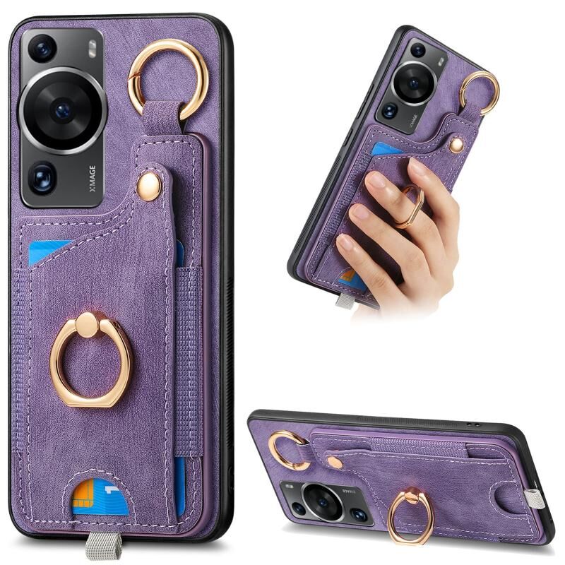 Για Huawei P60 Pro Ρετρό δέρμα αίσθηση δαχτυλίδι τσάντα κάρτα υπόθεση τηλεφώνου με Hang Loop (μωβ)