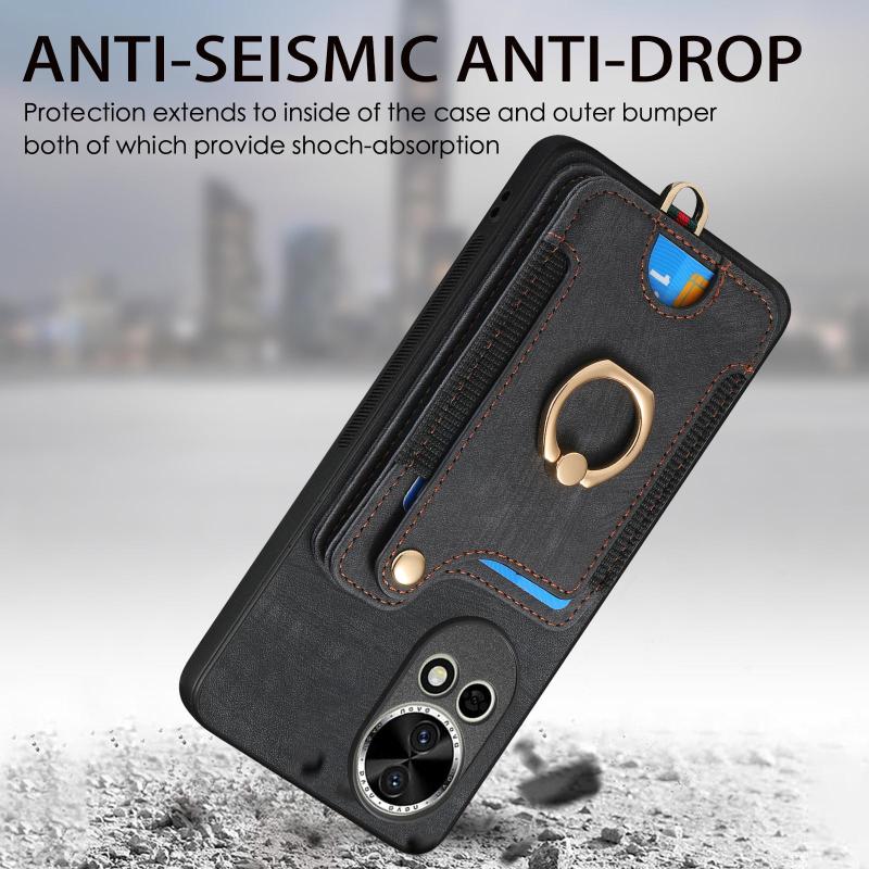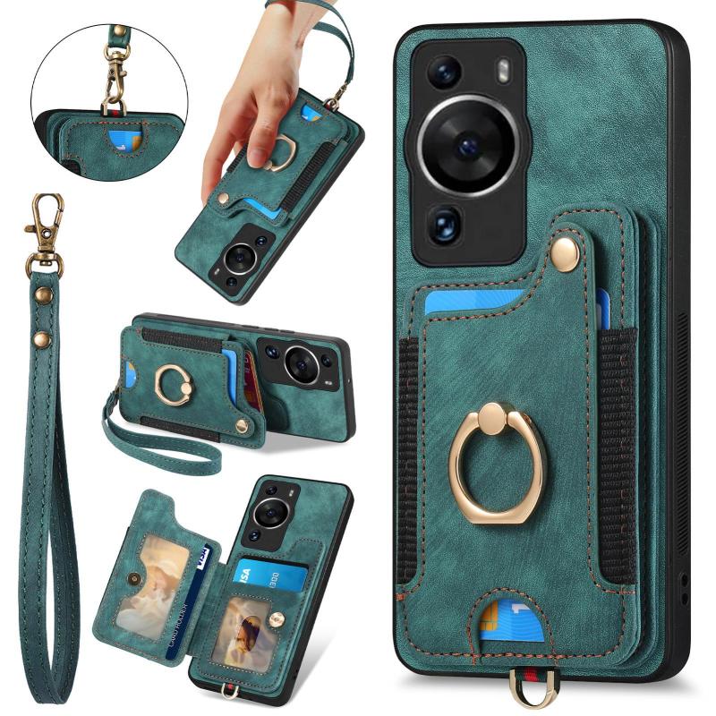 Θήκη τηλεφώνου Huawei P60 Retro με υφή δέρματος, με δακτύλιο και πολλαπλές θήκες για κάρτες (Πράσινο)
