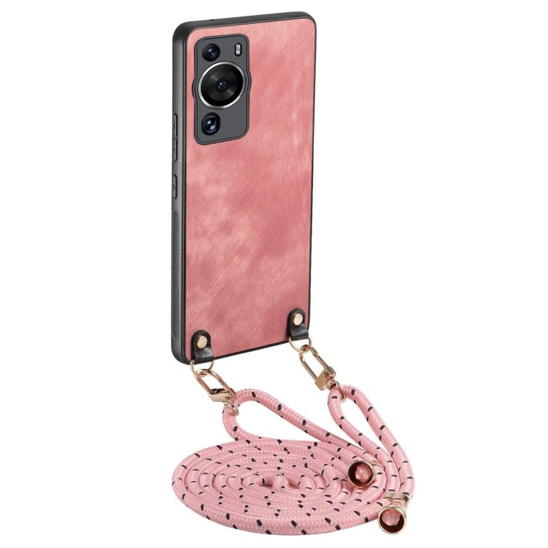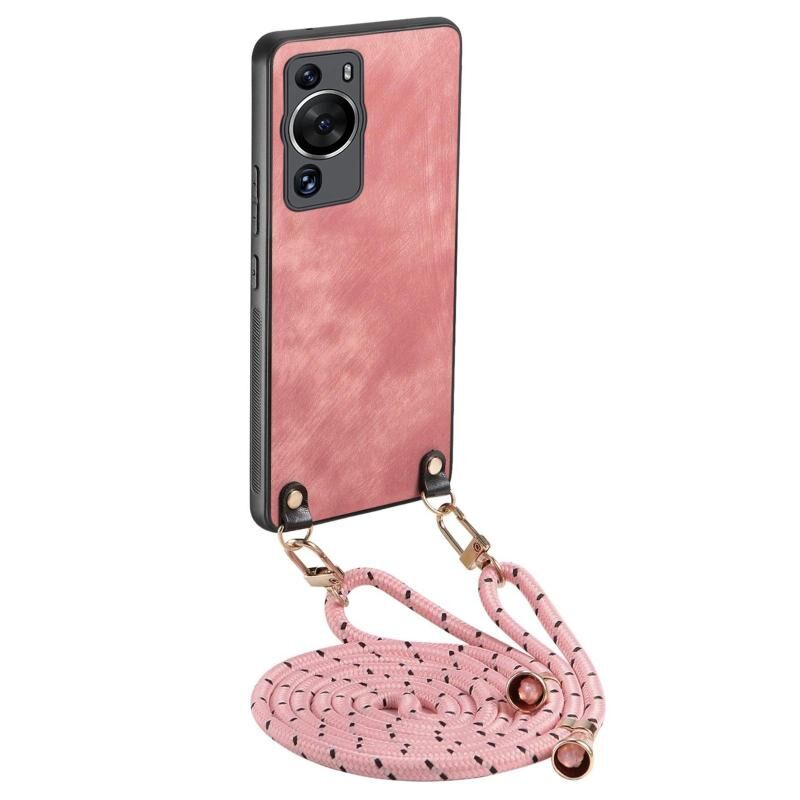 For Huawei P60 Vintage Leather PC Back Cover Phone Case with Crossbody Strap(Pink)