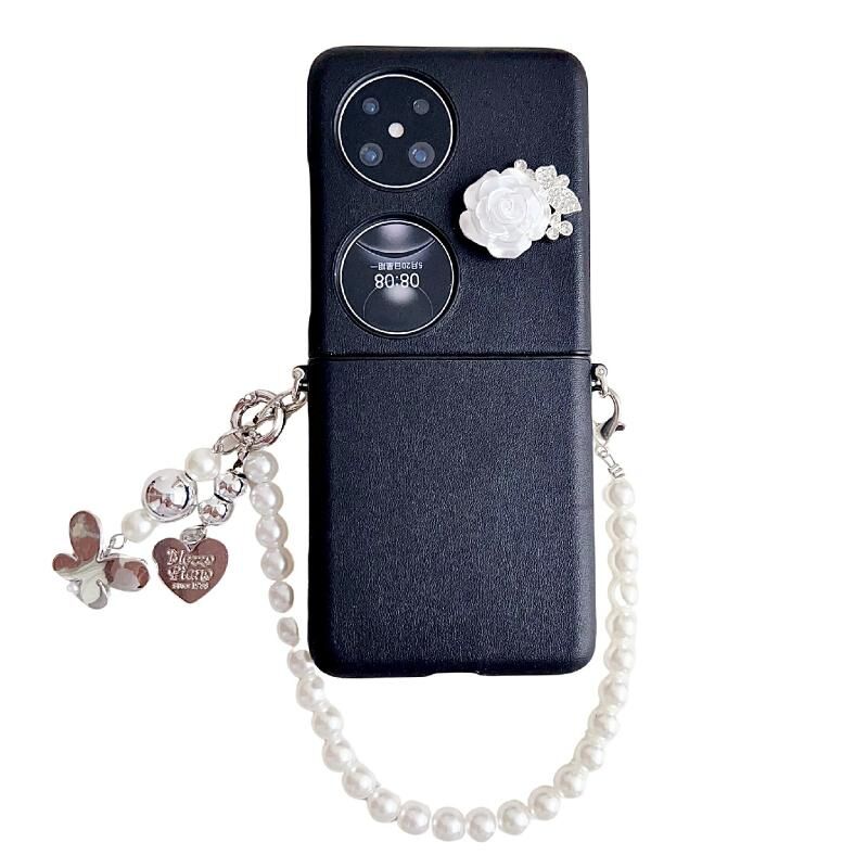 6. Η όμορφη δερμάτινη θήκη με υφή αγκράφας στο πλάι έχει ένα 3D μοτίβο τριαντάφυλλου και σχέδιο βραχιολιού με μαργαριτάρια.