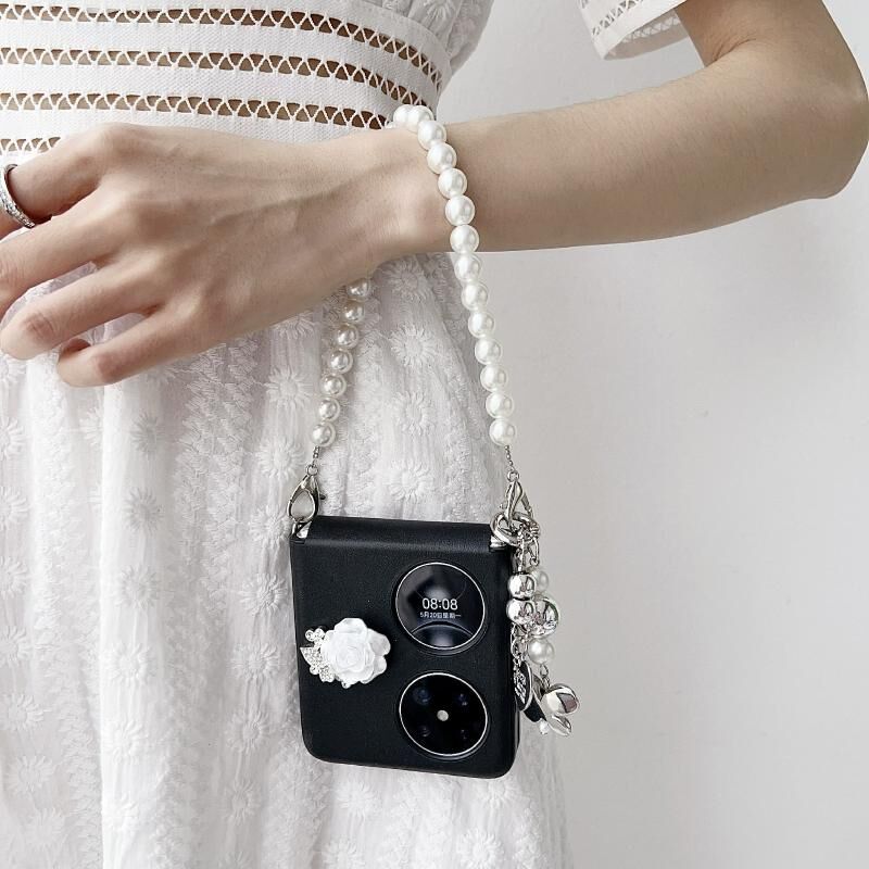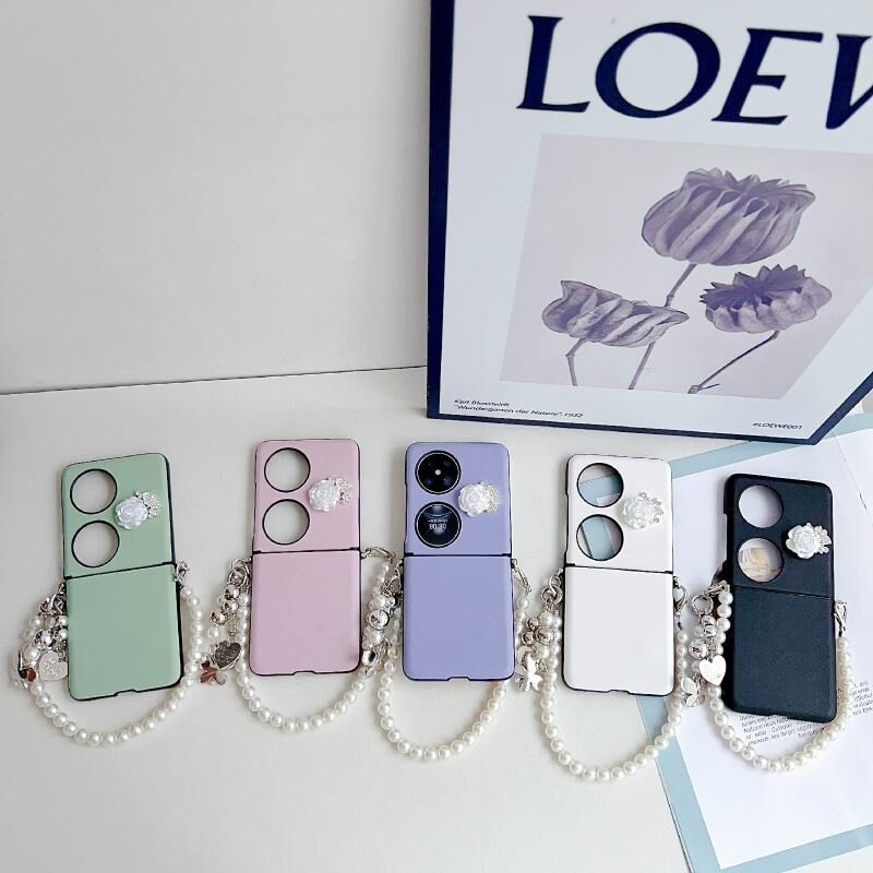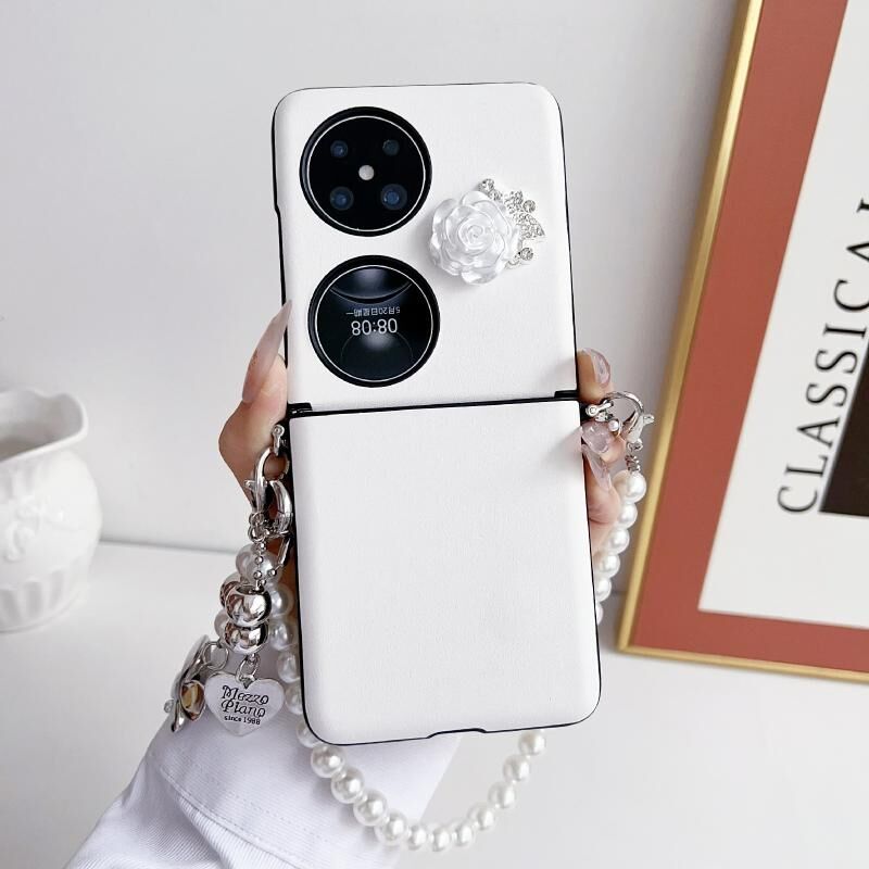 6. Η όμορφη δερμάτινη θήκη με υφή αγκράφας στο πλάι έχει ένα 3D μοτίβο τριαντάφυλλου και σχέδιο βραχιολιού με μαργαριτάρια.