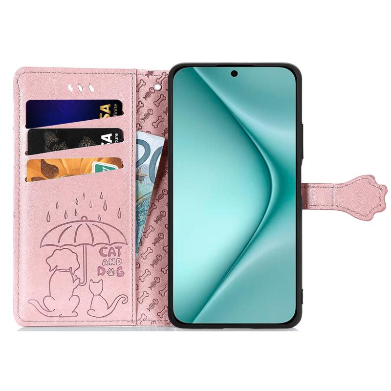 Θήκη Huawei Pura 70 με ανάγλυφο σχέδιο γάτας και σκύλου από δέρμα (Ροζ Χρυσό)