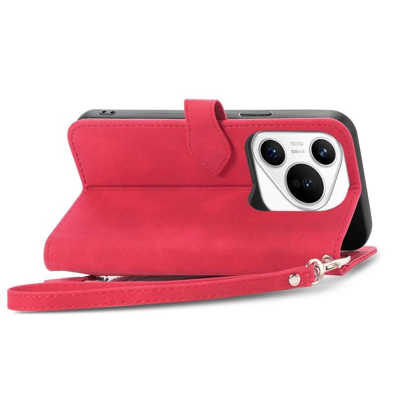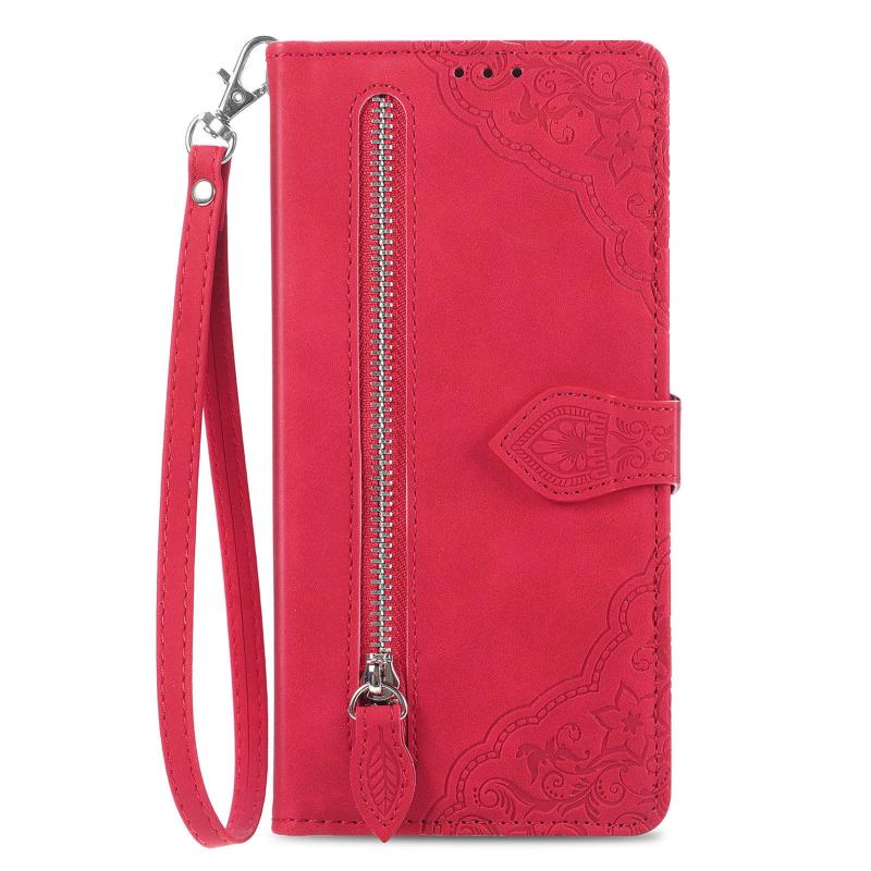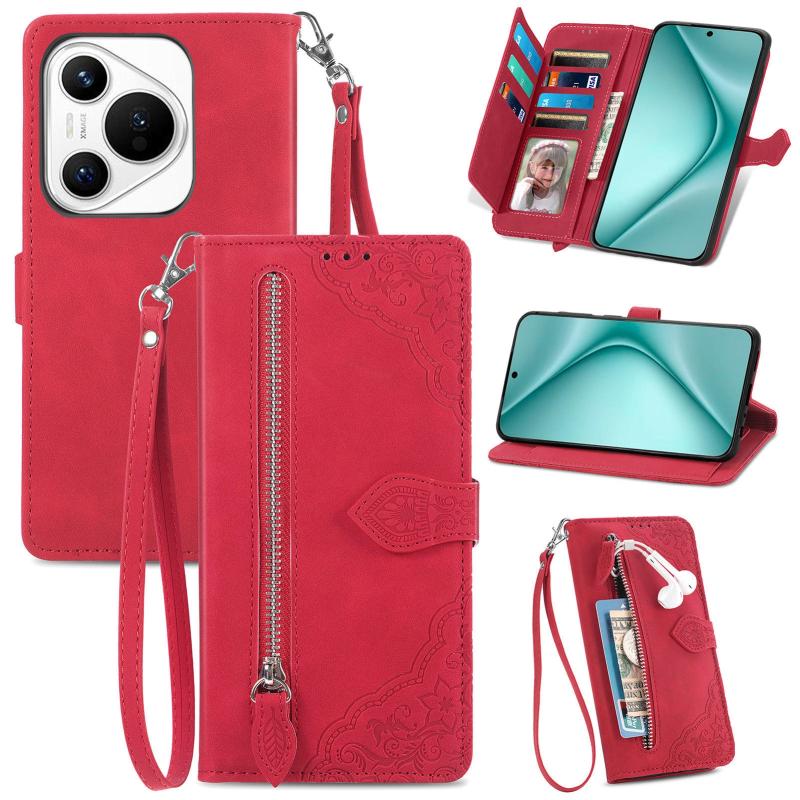 Θήκη Huawei Pura 70 Δερμάτινη με Ανάγλυφο Λουλούδι και Φερμουάρ (Κόκκινο)