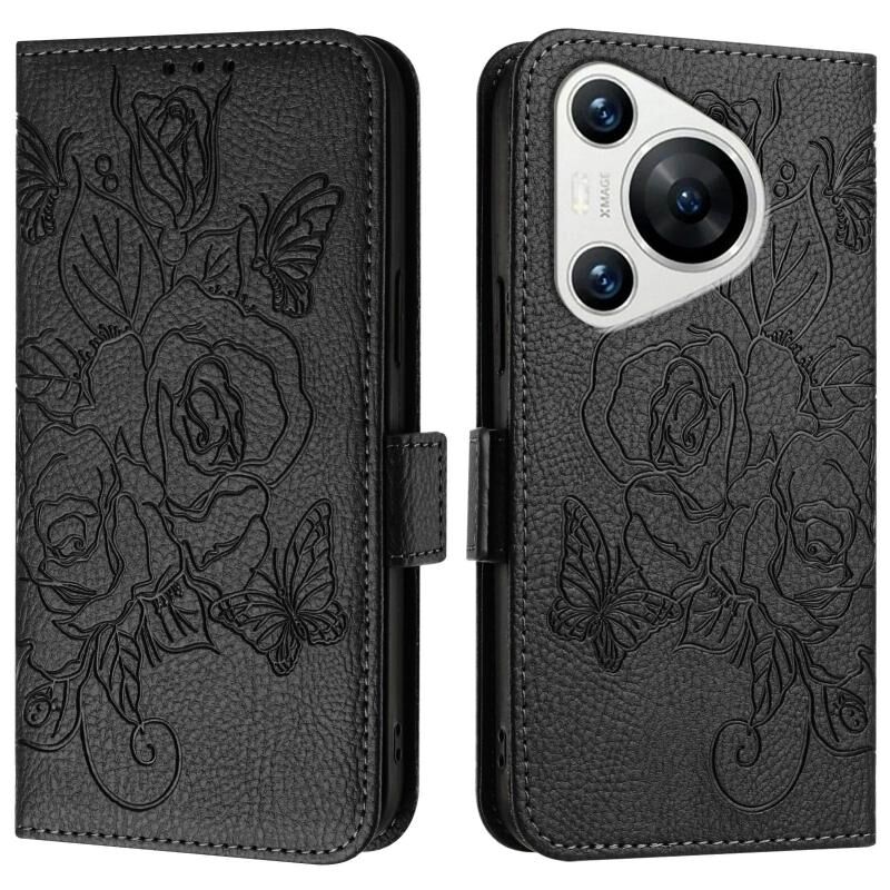 Για Huawei Pura 70 ανάγλυφο Rose RFID Anti-theft δερμάτινη θήκη τηλεφώνου (Μαύρο)
