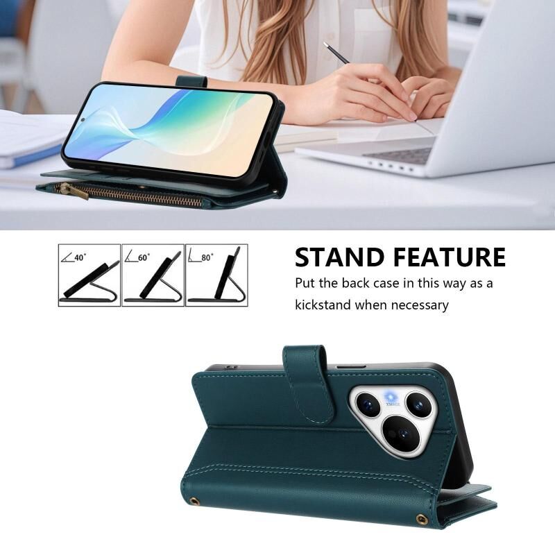 Θήκη δέρματος με μαγνητικό κλείσιμο, 9 θέσεις για κάρτες και φερμουάρ για Huawei Pura 70, με λουρί χειρός (Σκούρο Μπλε)