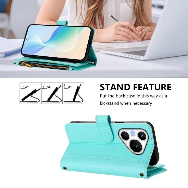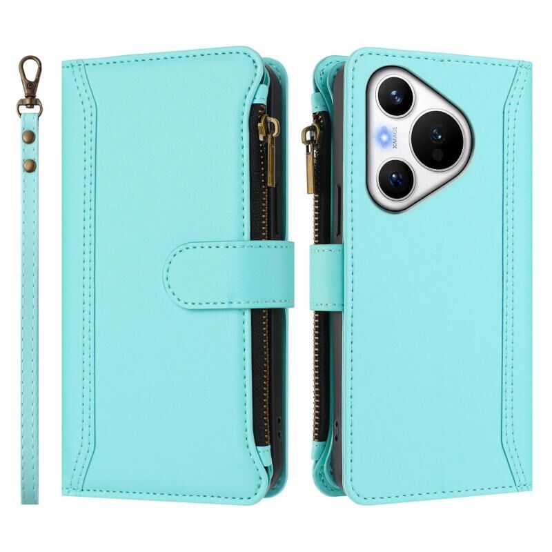 Θήκη δέρματος με μαγνητικό κλείσιμο, 9 θέσεις για κάρτες και φερμουάρ για Huawei Pura 70, με λουρί χειρός (Σκούρο Μπλε)
