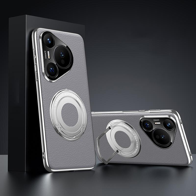For Huawei Pura 70 Plain Leather Hydric Metal Holder MagSafe Phone Case(Grey)
