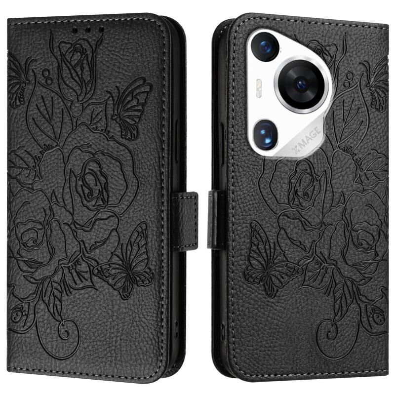 Για Huawei Pura 70 Pro ανάγλυφο Rose RFID Anti-theft δερμάτινη θήκη τηλεφώνου (Μαύρο)