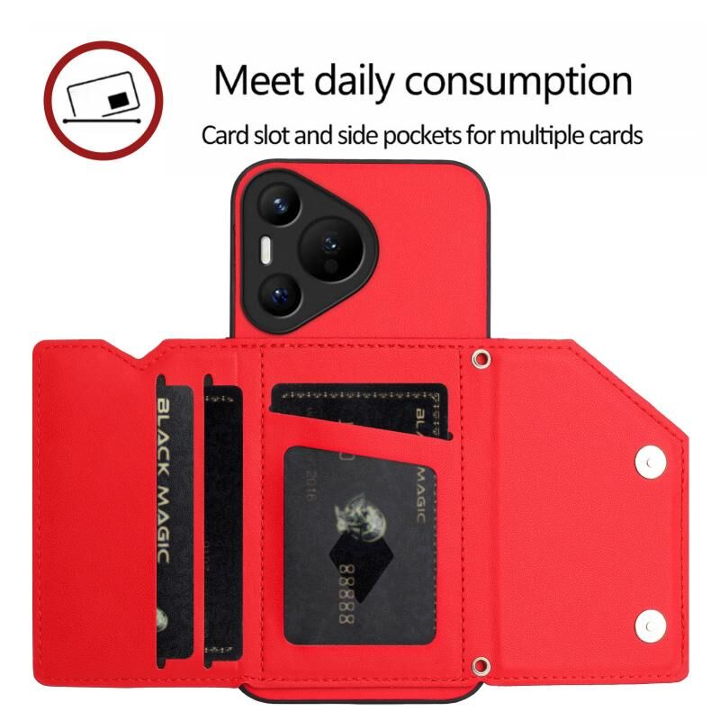Θήκη τηλεφώνου για Huawei Pura 70 με αίσθηση δέρματος, τέσσερις θήκες καρτών και λουρί καρπού (Κόκκινο)