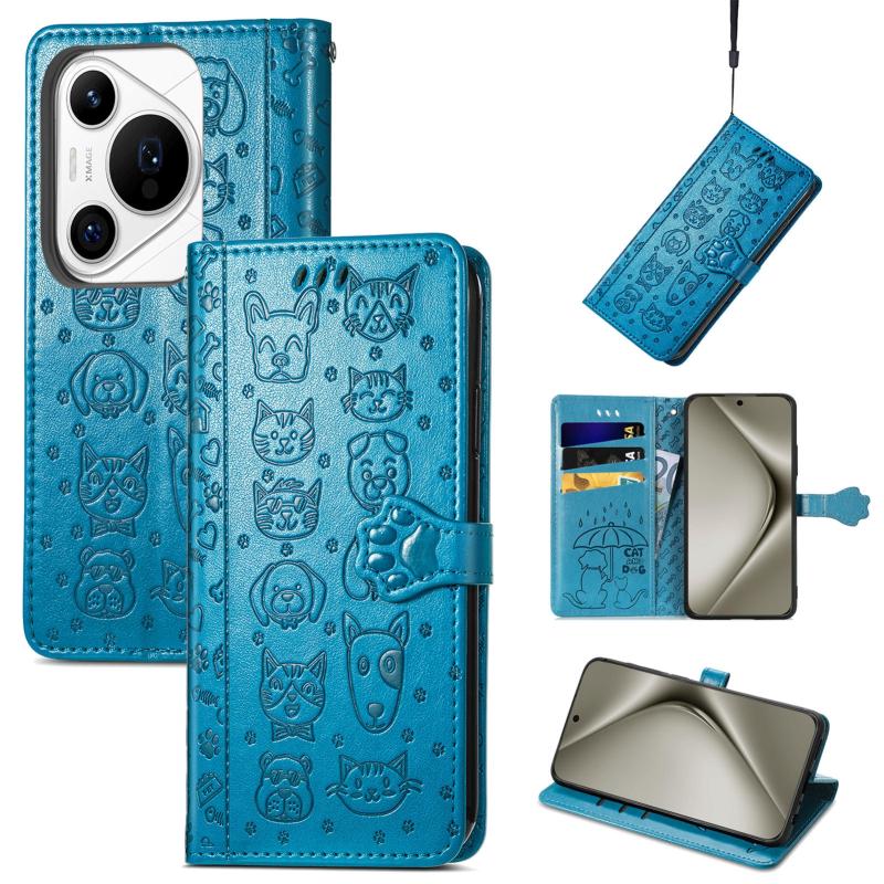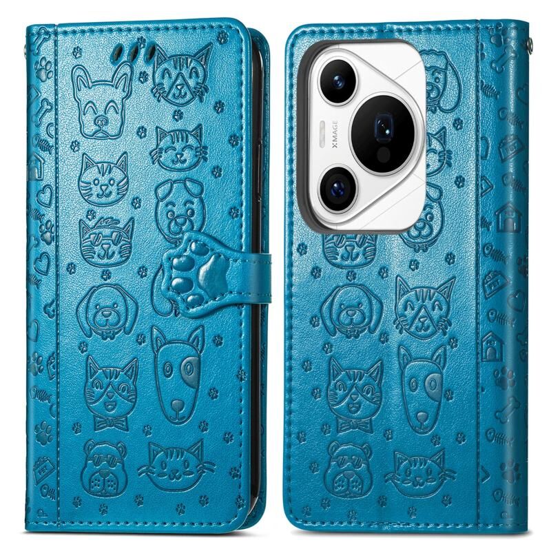 Θήκη Huawei Pura 70 Ultra Δερμάτινη με Χαρακτά Γάτας & Σκύλου (Μπλε)