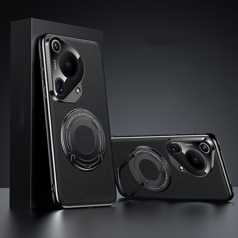For Huawei Pura 70 Ultra Plain Leather Hydric Metal Holder MagSafe Phone Case(Black)