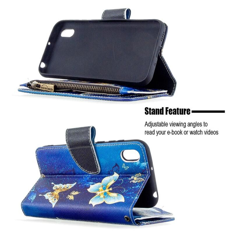 Θήκη Huawei Y5 (2019) με σχέδιο ζωγραφικής, χρώματα, οριζόντια αναδιπλούμενη από δέρμα με φερμουάρ, βάση στήριξης & θήκες για κάρτες & πορτοφόλι (Χρυσή Πεταλούδα)