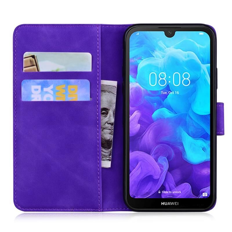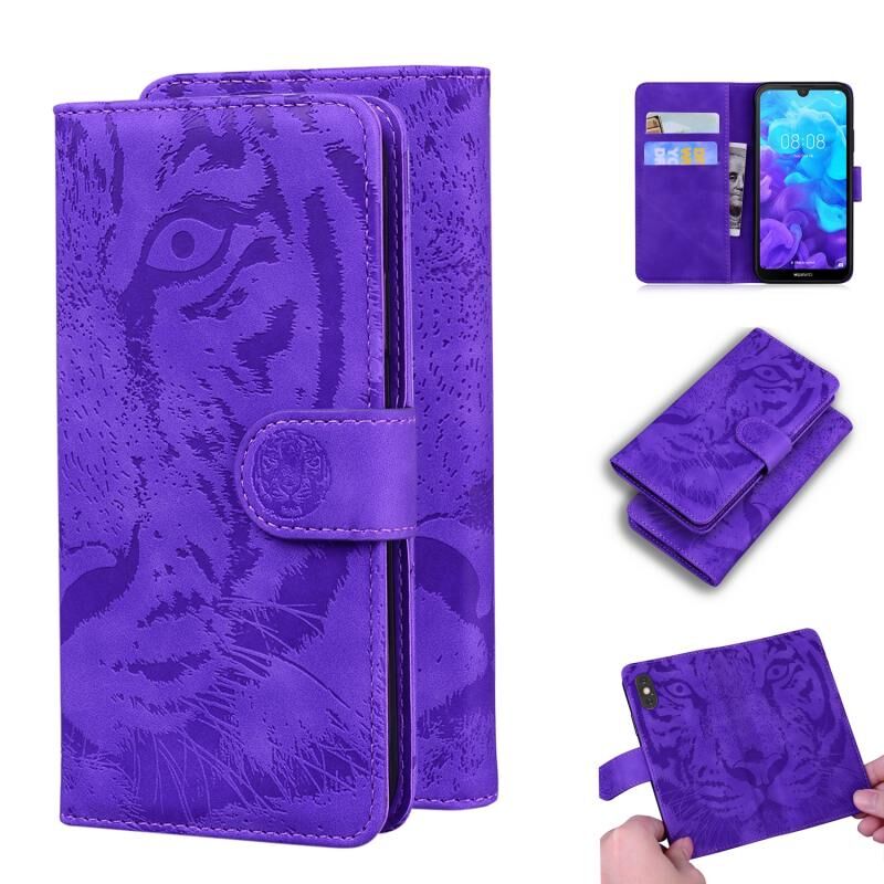 Θήκη δέρματος οριζόντιας αναδίπλωσης με ανάγλυφο σχέδιο τίγρης για Huawei Y5 (2019) / Honor 8S με βάση στήριξης & υποδοχές καρτών & πορτοφόλι (Καφέ)
