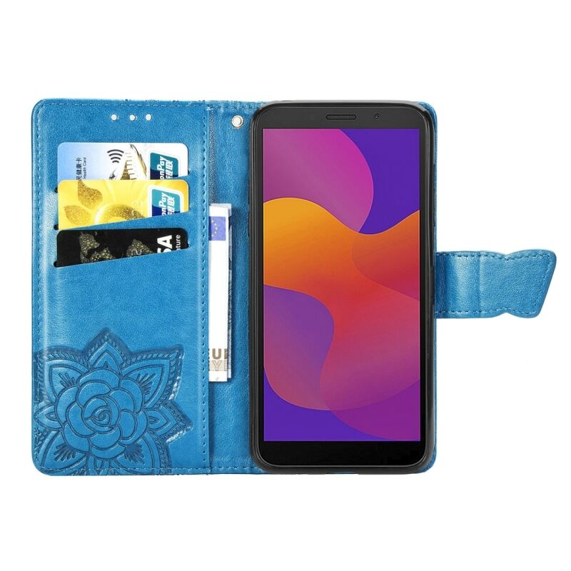 Για Huawei Y5P πεταλούδα αγάπη λουλούδι ανάγλυφο οριζόντια Flip δερμάτινη θήκη με βραχίονα / υποδοχή κάρτας / πορτοφόλι / κορδόνι (μπλε)
