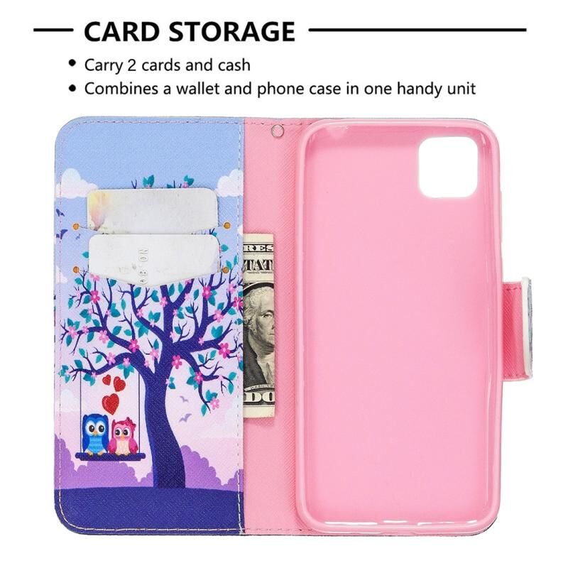 Θήκη δέρματος οριζόντιας αναδίπλωσης με σχέδια ζωγραφικής και χρώματα για Huawei Y5P / Honor 9S, με βάση στήριξης & υποδοχές καρτών & πορτοφόλι (Δύο κουκουβάγιες)