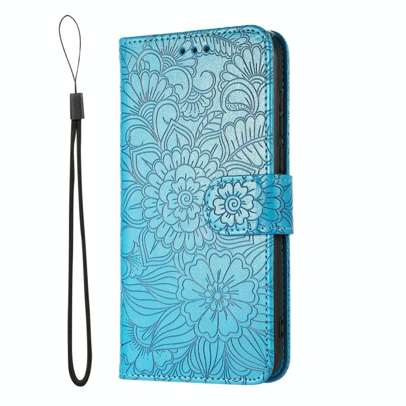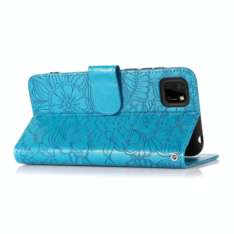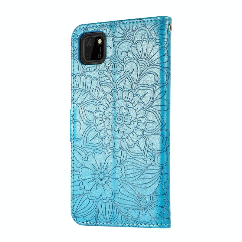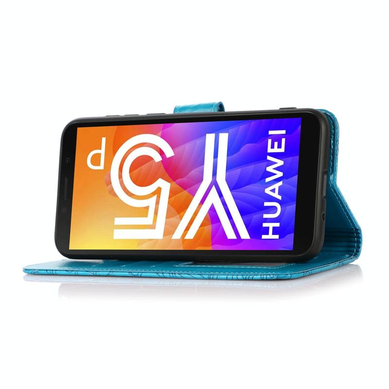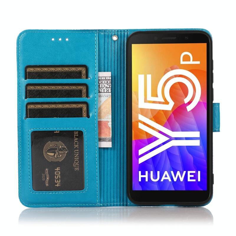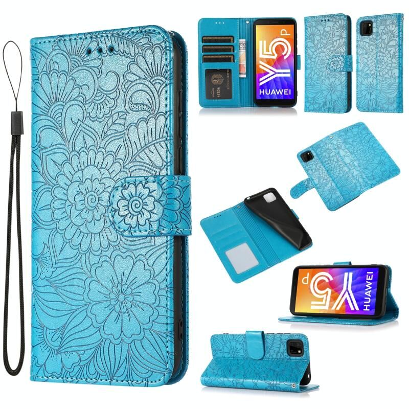 Θήκη Huawei Y5p με υφή δέρματος, ανάγλυφο ηλιοτρόπιο, οριζόντια, δερμάτινη με βάση στήριξης, θήκες καρτών, πορτοφόλι & λουρί (Μπλε)
