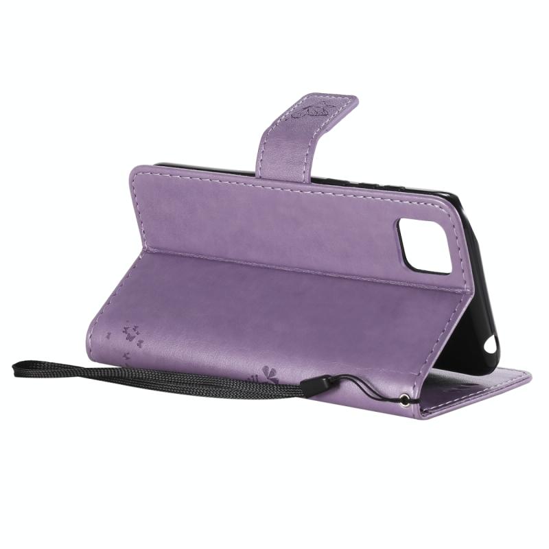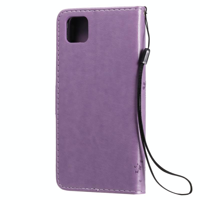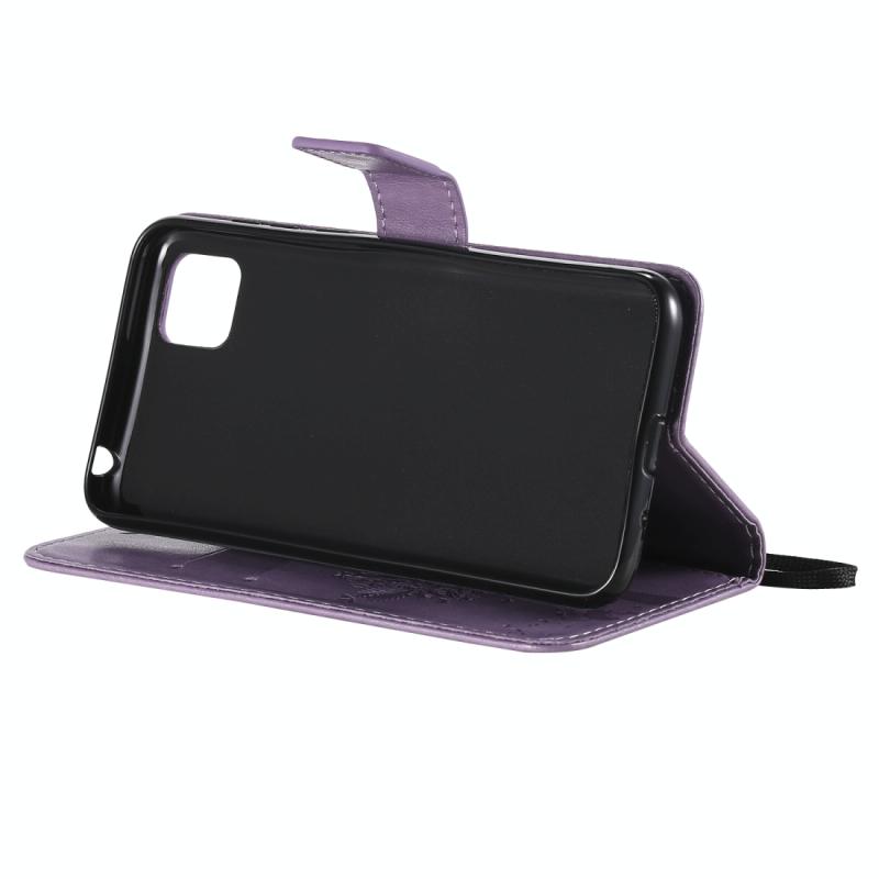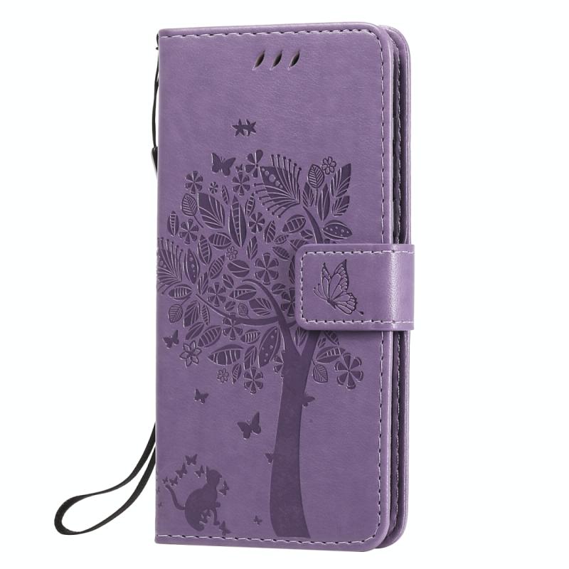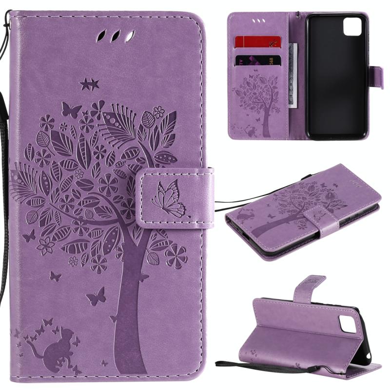 Θήκη Huawei Y5p Δερμάτινη Οριζόντια με Αναγλυφία Δέντρου & Γάτας με Στήριξη & Θήκες Καρτών & Πορτοφόλι & Λουρί (ανοιχτό μωβ)