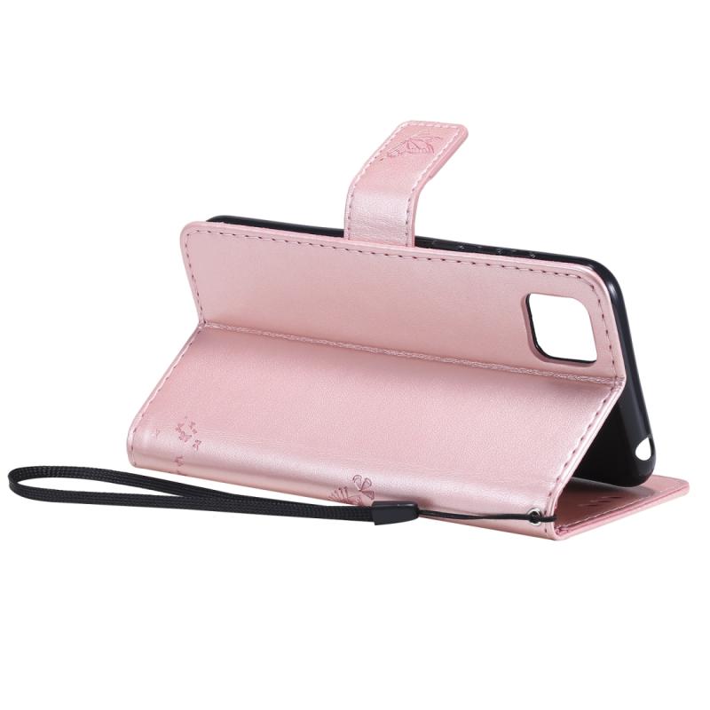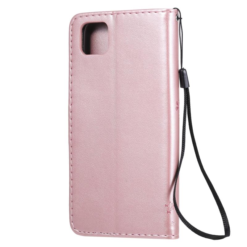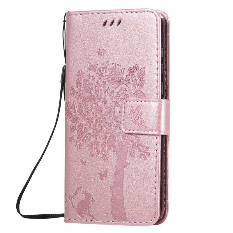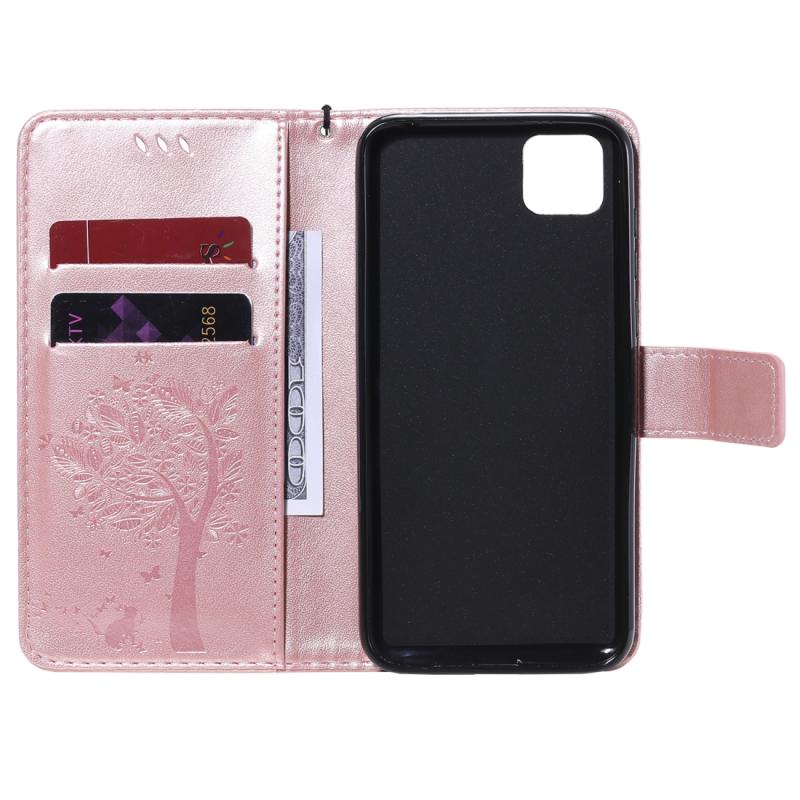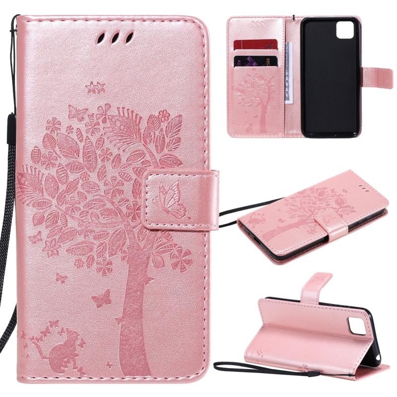 Θήκη Huawei Y5p Δερμάτινη Οριζόντια με Αναγλυφία Δέντρου & Γάτας με Στήριξη & Θήκες Καρτών & Πορτοφόλι & Λουρί (Ροζ χρυσός)